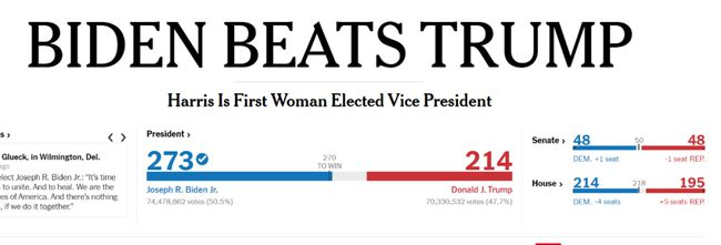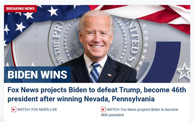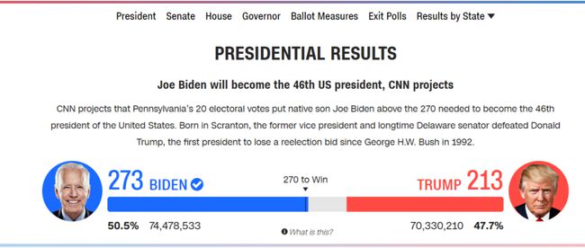 原因是宾夕法尼亚州PA的选票最终确定,拜登赢得宾夕法尼亚州的20张选举人票后,总票数超过半数(270张)。如该结果最终被认定有效,则拜登将在2020大选中笑到最后,当选第46任美国总统。